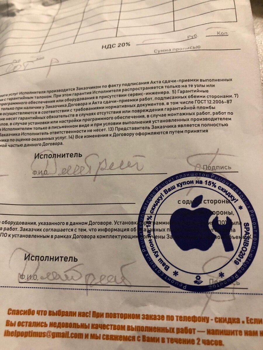 Предлагаю написать коллективное заявление о мошенничестве! Обязательно прочтите! Поменял дисплей на телефоне (айфон) в их "сервисе", приезжал "мастер" на дом. Китайскую копию дисплея они мне за 20000р поставили. Через месяц перестал работать Face ID. На гарантийном талоне стоит поддельная печать, круглая, но без реквизитов. Телефон на гарантийном талоне "левый", трубку никто не берет +74994906864, дозвониться невозможно. Я звоню их оператору, на номер, по которому я непосредственно заказ оформлял +74993488265. И такой наглости я никогда еще не видел. Они берут трубку, как только слышат слово гарантия, переключают якобы на телефон гарантийного отдела, по факту на какой-то левый номер, трубку никто не берет. Если набрать им еще раз, дозвониться с данного номера невозможно, они его похоже в блэклист добавляют! Но с другого номера сразу же дозваниваешься:) Я звонил с пяти разных номеров, они как только меня слышат, сразу сбрасывают и добавляют очередной мой номер в блэклист. Непосредственн