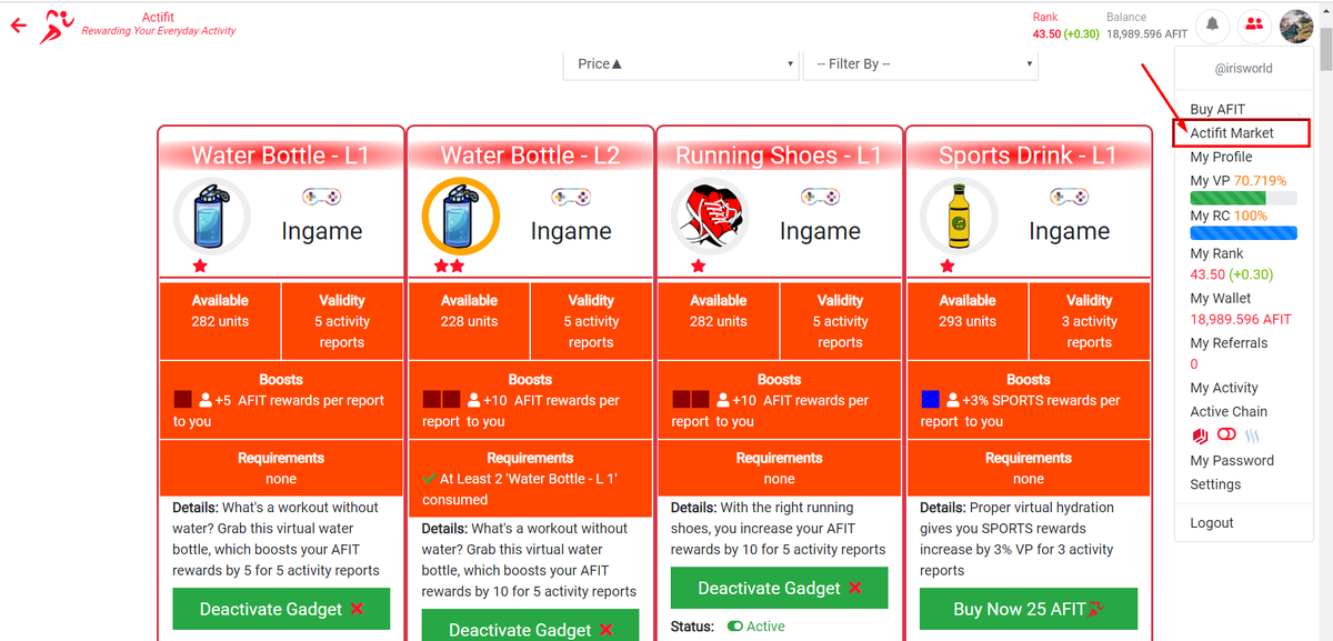 Краткий обзор и общее знакомство с платформой Актифит мы уже прошли. Надеюсь, что кто-то уже присоединился к этому проекту и начал зарабатывать свои первые токена AFIT, а вместе с ними и токены HIVE или Steem. Кто не понимает, о чем я тут почитайте предыдущие статьи на канале. А сегодня я поделюсь с вами еще одной маленькой хитростью на Actifit! Если вы изучали страничку актифит, то наверняка видели там вкладку Actifit Market Actifit Market - это внутренний магазин платформы. Здесь вы можете купить разные инструментики, которые по сути являются бустами, т.е. усилителями... Усилителями чего? Вашего заработка! Помимо бустов в магазине есть и консультации и книжки по тренировкам, питанию и т. п. от коучей. Покупая разные инструменты, вы покупаете дополнительные токены AFIT, SPORTS, APX. Я советую покупать те, что дают дополнительные токены AFIT в штуках, но не в процентах %. По крайней мере, пока у вас не накопится приличная сумма AFIT или AFITX, и пока ваш рейтинг не вырастит. Иначе,