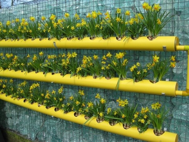 Из кусков старых труб можно сделать отличные подвесные клумбы. Крепятся они на прочную бечевку или металлическую цепочку к любой перекладине. Отличный способ озеленения веранды, беседки и даже забора!