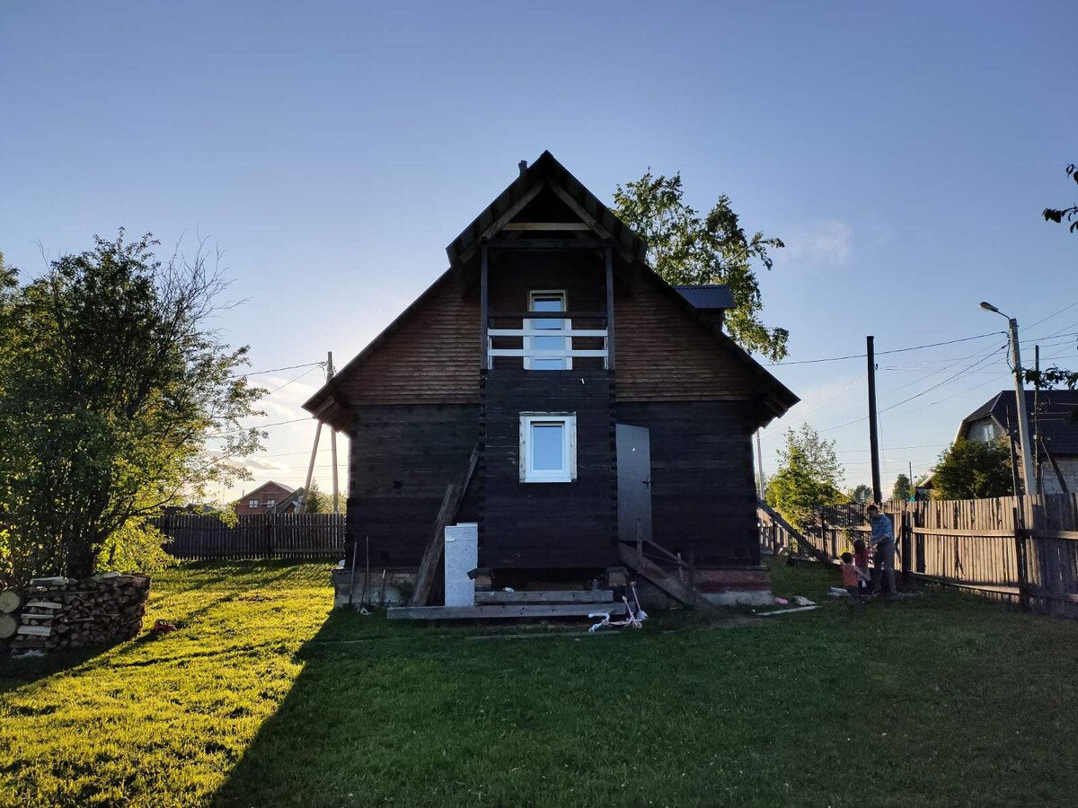 Сама коробка дома у меня сделана из бруса 150×150, а на стенах тамбура решил сэкономить, и сделать из бруса 150×100, на ребро. Собран тамбур в лапу, по углам и по периметру шканты стоят. Прочность сомнений не вызывает. Сверху стоит балкон с крышей двускатной. Сама крыша, вылеты крыши балкона небольшие, и поэтому косым дождём стены тамбура мочит. А тут для сравнения "чистое" место, с косяком Дом покрыт антисептиком, водоотталкивающим. А джут между рядами мочит насквозь, когда дождь идёт сутки. От него и сам брус намокает. Не страшно конечно, если это летом, тут же продует, а если осенью то может и плесень пойти. В основной коробке такого нет. Дом полностью проконопачен. Брус 150×150 маловат всё-таки для нашего региона. Планирую этим летом утеплить дом ватой 50мм, плитами, поверх ветрозащиту, а потом сайдинг. Тут и дожди уже не страшны, и само дерево закрыто будет от солнца. Но это буду делать когда погода хорошая постоит недельку хотя бы, чтобы продуло стены, и перед этим антисептик
