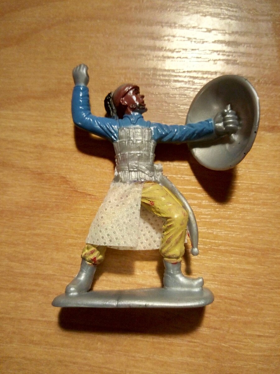 Поскольку воинственная поза солдатика нас полностью устраивает, мы оставим её как есть. Как только шлем из Поксипола высох (примерно, полчаса ожидания), начинаем раскрашивать нашего воина (мы используем акриловые краски «Zvezda») в соответствии с заранее найденными и изученными примерами-образами восточных (в нашем сегодняшнем случае, арабских) воинов средневековья.