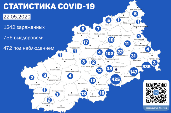По данным на утро 22 мая, в Тверской области подтверждено 39 новых случаев COVID-19. При этом за сутки выздоровели 22 человека, умерли трое. Общее число заразившихся коронавирусной инфекции в Тверской области составило 1242 человека. Треть из них – 425 человек – приходится на Тверь. В Кимрах зарегистрировано 335 заразившихся COVID-19, 147 – в Конаковском районе. Первый случай коронавиурса подтвержден в Западнодвинском районе. «Всего 756 заболевших выздоровели и выписаны из больниц. 472 зараженных изолированы, находятся под постоянным наблюдением медиков и получают необходимое лечение, – сообщили в региональном оперативном штабе по предупреждению завоза и распространения коронавирусной инфекции. – 14 человек с подтвержденным коронавирусом скончались, все они имели сопутствующие хронические заболевания».