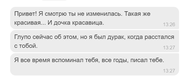 И тут вот он, пишет в соц сетях о том что жалеет о нашем расставании и т.п. Поведал, что между вторым и третьим браком отправлял мне письмо почтой. Я к тому времени уже покинула родительский дом и мой мама распорядилась письмом по своему усмотрению-сожгла.