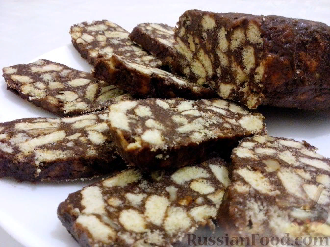 Сладкая колбаса Продукты (на 8 порций) Печенье (например, любое сахарное) - 400 г Молоко сгущенное - 0,5 банки (190 г) Масло сливочное (комнатной температуры) - 100 г Орех грецкий - 50 г Какао-порошок - 3 ст. ложки Ингредиенты для приготовления сладкой колбасы. Как приготовить сладкую колбасу из печенья: