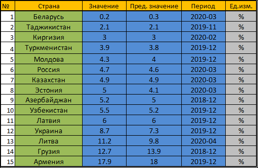 Безработный — человек в трудоспособном возрасте, умеющий и желающий работать, но не имеющий работы и трудового дохода по независящим от него причина. На сегодняшний день количество безработных в России растет и прогнозы неутешительны. По словам главы Минтруда Антона Котякова число безработных вскоре может достигнуть 5-6 мил. человек ( РБК ) . О увеличении числа безработных в своих выступлениях говорит и вице-премьер Татьяна Голикова. Несомненно рост безработицы вызван теми ограничительными мерами , которые приняты для борьбы с коронавирусом. Это было вступление. В статье я просто хотел привести сравнительную таблицу по уровню безработицы в странах , когда-то входивших в состав сильнейшего в мире государства СССР. Как видно из приведенных выше данных, самая благоприятная обстановка с безработицей в Белоруссии, там количество безработных в процентном соотношении приближается к нулю. Может стоит руководству нашей страны позаимствовать практику трудоустройства населения у соседа?