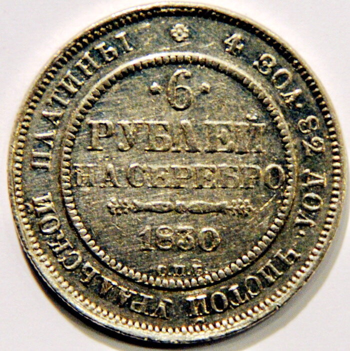За весь период обращения платиновой монеты с 1828 по 1845 год отчеканено было: трех-рублевиков- 1 373 691, шести-рублевиков - 14 847 и двенадцати-рублевиков - 3 474 на общую сумму 4 251 843 рубля, а возвращено было монет на сумму 3 263 292 рубля. Таким образом, ПОЧТИ НА ОДИН МИЛЛИОН РУБЛЕЙ осталось платиновых монет у населения. Они еще долго находились в добровольном обращении, потому что к ним привыкли и в них верили. В дальнейшем вместе с ростом цены на платину, эти монеты превращали в ЮВЕЛИРНЫЕ ИЗДЕЛИЯ, и их становилось все меньше, и теперь "платиновые", особенно шести- и двенадцати-рублевики, редкость среди редкостей, украшение коллекций.