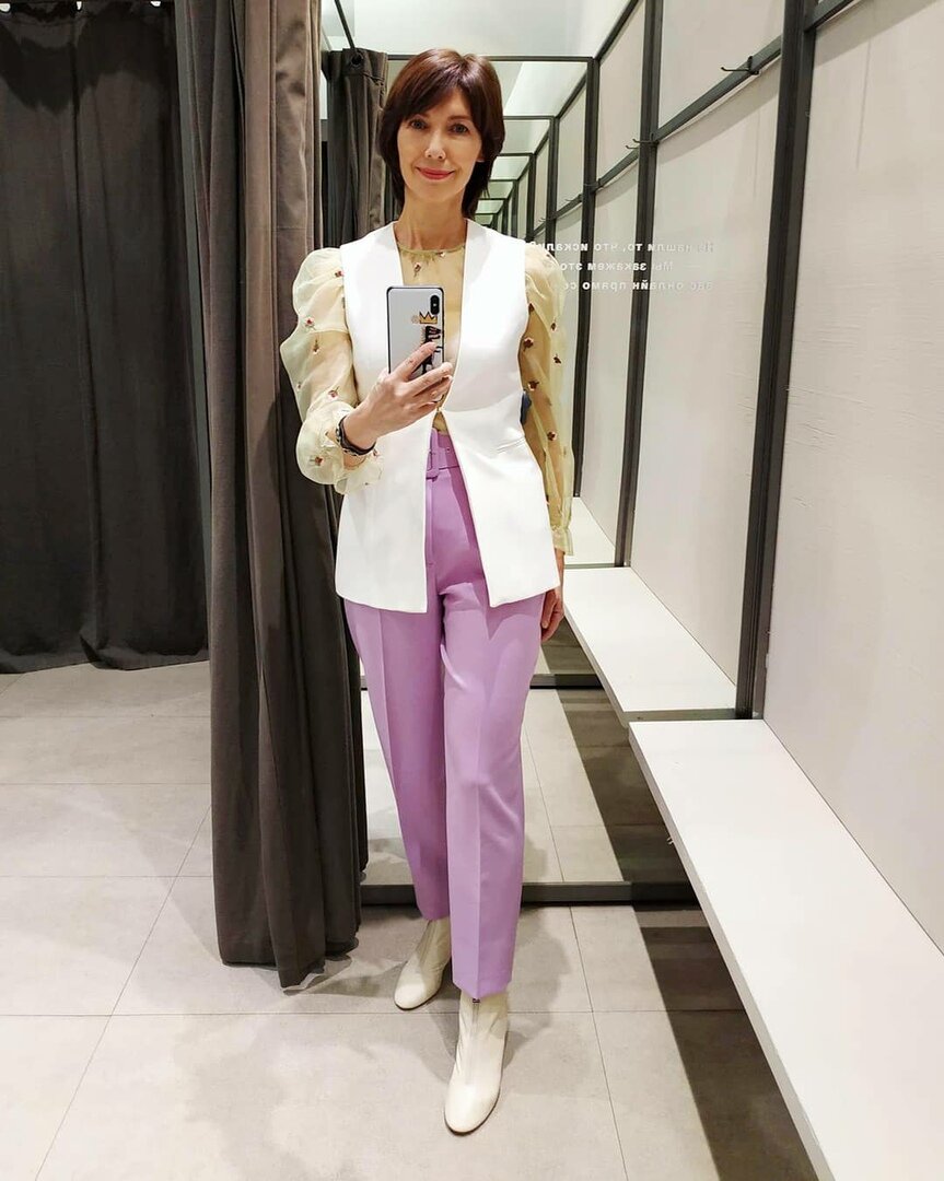 Свежие оттенки весенних цветов вкупе с белым могут создать романтическое настроение даже в строгих классических силуэтах. Альтернатива платью - лаконичные однотонные образы в белых и нежных пастельных оттенках. Особенность образа в сочетании разных фактур: полупрозрачная блуза плюс офисная ткань. Акцент на талии подчеркнет достоинства фигуры и сделает силуэт более актуальным.