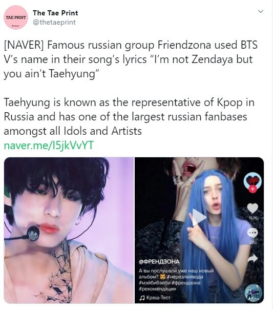 Известная российская группа Френдзона, основанная в 2018 году, недавно выпустила новый альбом, состоящий из 11 треков, под названием «Не разлей вода». Одна из песен с альбома группы привлекла внимание российской фан-базы Тэхёна (Taehyung) из BTS. Ви (V) из BTS является одним из самых популярных айдолов среди российских поклонников, поэтому упоминание его имени в песни российской музыкальной группы не могло пройти мимо Арми. В песне «Краш-Тест» можно услышать следующие строки: Я конечно не Зендея, но ты тоже не Техён Эта песня – еще одно доказательство того, что к-поп направление становится все популярнее с каждым днем, захватывая все страны, различные возрастные группы и оказывая влияние на другие музыкальные жанры.