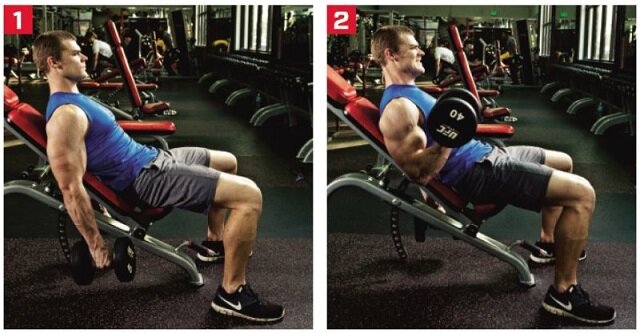 1.СГИБАНИЕ РУК С ГАНТЕЛЯМИ НА НАКЛОННОЙ СКАМЬЕ ТЕХНИКА УПРАЖНЕНИЯ – возьмите гантели и ляжте на наклонную скамью под углом 45 градусов, лопатки и затылок плотно прижимаются к спинке и из этого положения выполните сгибание рук, на протяжении упражнения не отрывайте голову и спину от гимнастической скамьи, взгляд всегда направлен в потолок. СОВЕТЫ - при выполнении подъёмов и опусканий, следите чтобы локти оставались на месте и не уходили назад, допускается их движение немного вперёд в процессе подъёмов гантелей на бицепс. 2.ПОДТЯГИВАНИЯ ОБРАТНЫМ ХВАТОМ ТЕХНИКА УПРАЖНЕНИЯ – упражнение не требующее специальных приспособлений, для выполнения нужен лишь турник, возьмитесь за него обратным хватом, подтянитесь до уровня подбородка и медленно опуститесь практически полностью распрямляя руки, оставляя небольшое напряжение в бицепсах. Не позволяйте корпусу раскачивать, иначе за счёт амплитуды упражнение облегчается и бицепс получает меньшую нагрузку. СОВЕТЫ - для тех кто может выполнить более 1