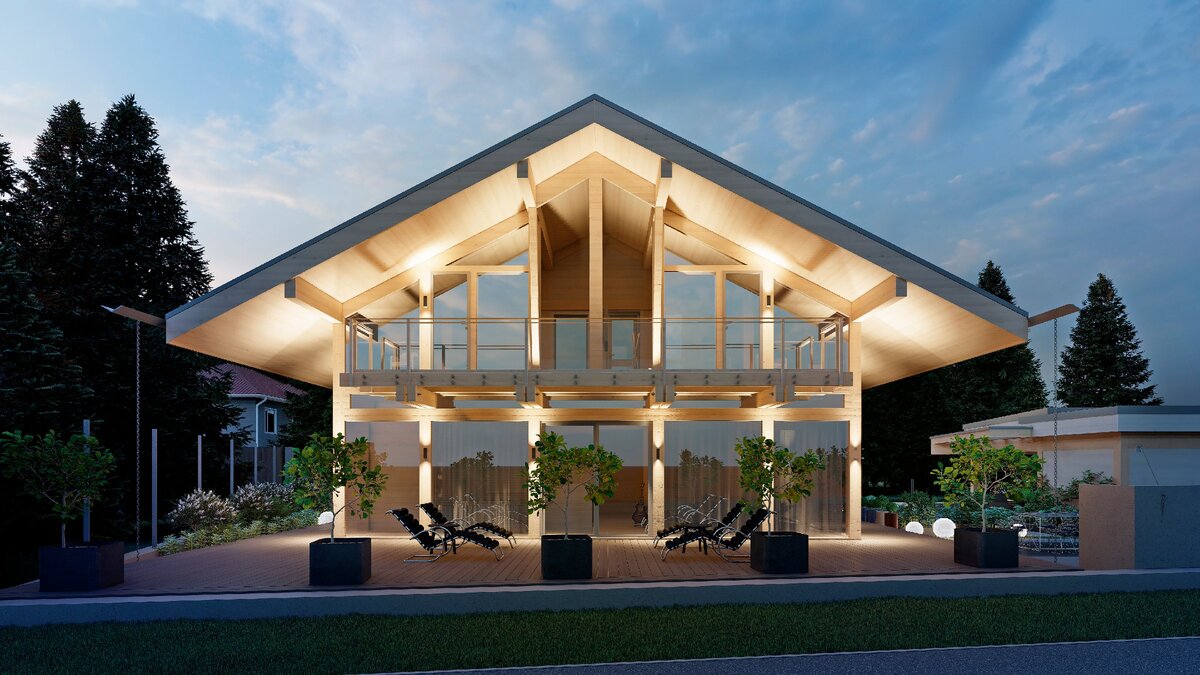 - Свесы кровли достигают 2м, что позволяет защитить стены от воздействия непогоды и прямых солнечных лучей, а также обеспечить комфортную затененность даже на солнечной стороне.