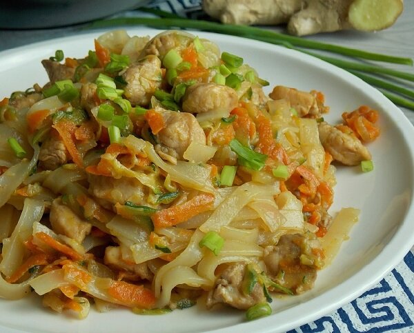 Курица с кабачками и морковью в пикантном соусе, быстро приготовленная в сковороде вок – простое, вкусное овощное блюдо из японской кухни. Подается вместе с рисовой лапшой (или обычными спагетти). Это легкое блюдо без глютена. Если хотите полностью выдержать японский стиль, рекомендую съесть палочками (мои дети очень веселились, пытаясь освоить японский способ еды). Ингредиенты: Приготовление: Приятного аппетита! Источник - сайт РЕЦЕПТЫ ДЛЯ ДУХОВКИ