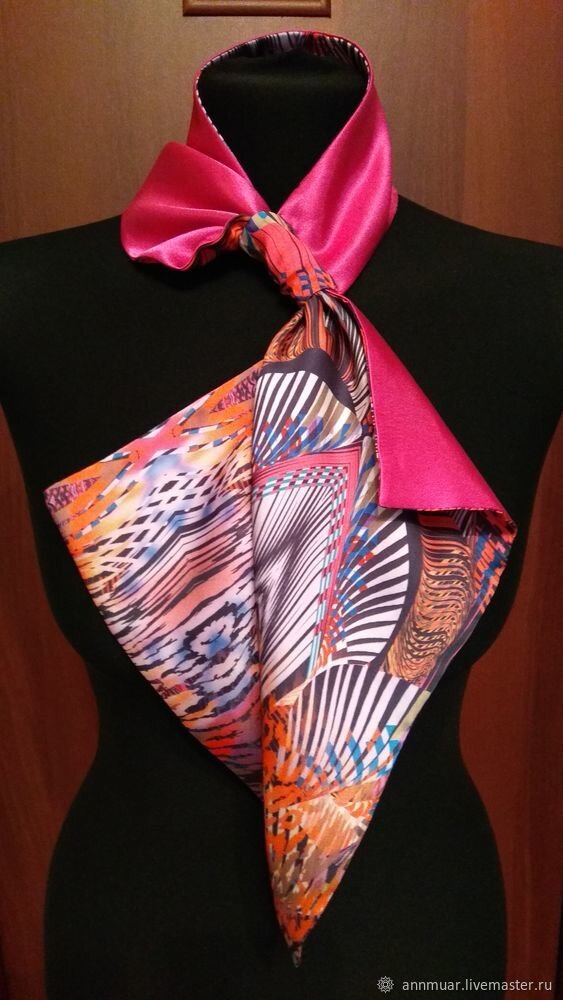 Сегодня, я хочу представить вам мастер-класс «Как сшить французскую косынку». Использовать можно различные ткани: хлопок, шифон, атлас, шелк и так далее. На мой взгляд косынка, сшитая из блестящего материала (атлас, шелк ), смотрится красиво и эффектно. Такие косынки шьют из двух слоев ткани. Чаще всего используются два разных куска ткани: один цветной, принтованный, а второй — однотонный, желательно гармонирующий с каким-нибудь цветом на первом слое. Чтобы нам сшить такую косынку, потребуется два совсем небольших отрезка ткани. Такой шарфик шить очень быстро. Потратив совсем немного времени, у вас появится эффектный шарф-косынка. Итак: нам потребуется для работы, линейка, сантиметровая лента, мел, ножницы, швейная машинка, булавки, иголка с ниткой, утюг, два слоя ткани, вырезанные по выкройке, которая представлена на фото. Выкроить можно по очереди: сначала один слой, потом второй. А можно сразу два слоя сложить лицевой стороной внутрь, на изнаночную сторону положить подготовленное ле