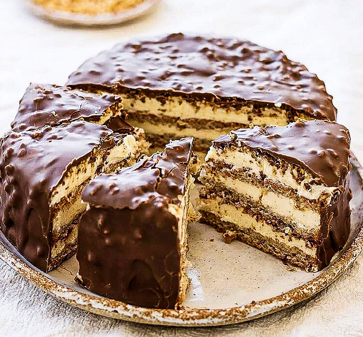 Ингредиенты: для бисквита: для крема 1 : для крема 2 : декор: воздушный рис, молочный шоколад - 250 г Порядок приготовления: Бисквит: Измельчить орехи и добавить в муку и 80% сахара. Белки взбить до устойчивых пик. Добавить оставшийся сахар. Белковую массу аккуратно соединить с орехами, мукой и сахаром. Массу вылить в 2 формы 16 см и выпекать при 150 градусах 45 минут. Готовим крем 1: молоко с сахаром довести до кипения постоянно помешивая. Муку соединить со слегка взбитыми яйцами. В полученную смесь влить молочный сироп. Всю смесь варить 5 минут помешивая. Затем охладить до 20 градусов и смешать с кремом 2. Готовим крем 2: яйца, сахар и молоко довести до кипения и кипятить 5 минут помешивая. Охладить до 20 градусов и смешать со сливочным маслом. Взбиваем массу 20 минут. Должен получиться светлый крем. Сборка торта: разрезать бисквит на коржи. Промазать коржи кремом. Украсить воздушным рисом и покрыть шоколадной глазурью. Приятного аппетита!