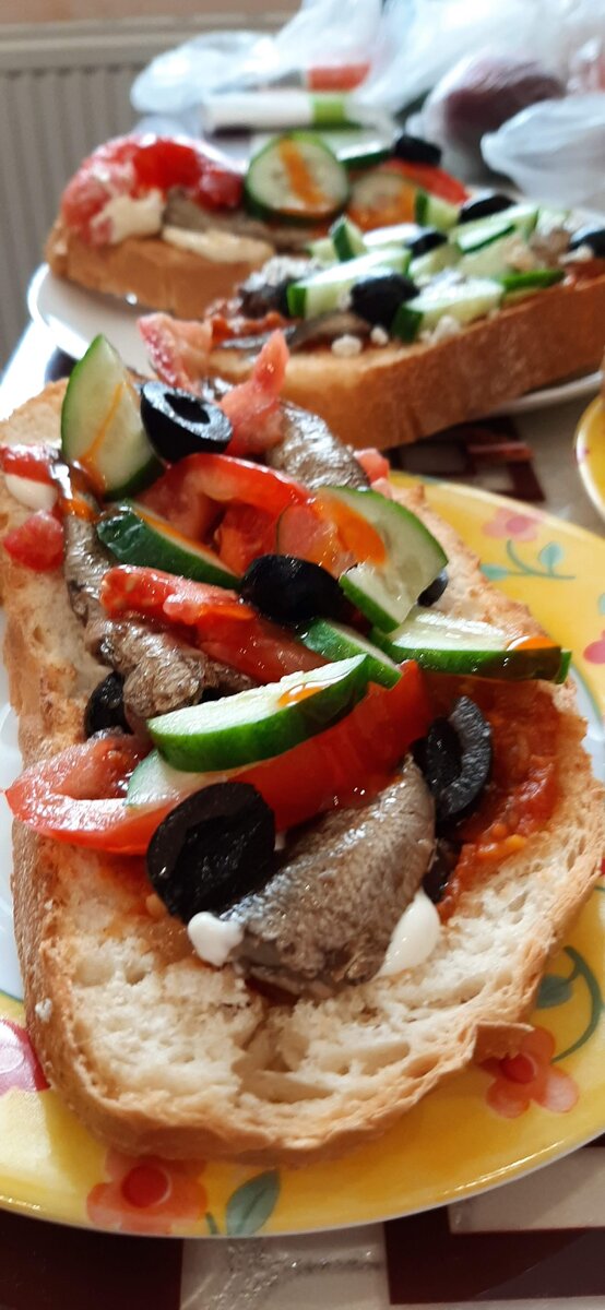 Ингредиенты: Шпроты, помидоры, огурцы, майонез, кетчуп, оливки, хлеб.