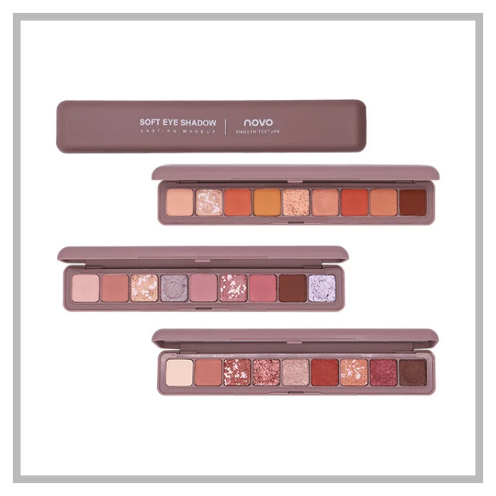 Сегодня расскажу про палетку теней NOVO Soft Eye Shadow. У меня палитра 02, а так есть три варианта цветов. Ну во первых оформление - оно очень приятное, очень креативное. Палетка пыльно-розового цвета, продолговатой формы. Очень приятная на ощупь. В палетке 9 оттенков: 2 чисто матовых, 3 матовых с почти незаметныс микрошиммером, 3 блестящих оттенка и 1 глиттер. Идеальная нюдовая нежно-розовая гамма, в стилистике Huda Beauty. Я бы сказала что это палетка на каждый день. Там есть базовые нейтральные оттенки и такие красивые шиммеры. Блестящие оттенки там обалденные, они очень красиво сверкают и переливаются, есть дуохромы обалденные. В принципе эта палетка для умеренных макияжей, красивых в дневном свете. А при добавлении блестящих оттенков получается хороший вечерний макияж. Текстура теней очень приятная, шелковистая, мягкая на ощупь. Тени мягко и равномерно ложатся без пятен, очень легко растушевываются. Нанесение: хорошо ложатся, растушевываются, не пылят, не осыпаются, не скаты
