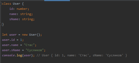 Добрый день, это канал посвященный небольшим инструкциям, которые я пишу для себя и людей, которые являются начинающими разработчиками. Сегодня разберем, как в TS создавать классы: Поля класса Структура: class <имя класса> { <имя поля>: <тип данных поля>; } После проделанного кода у нас создался объект user от класса User и в нем есть набор полей. Так же у этого юзера имеется строгий набор полей, который так же будет выдавать ошибки компиляции, с случае несоответствия: Также писать все поля для юзера можно следующим образом: Обратите внимания, что если полей хватать не будет, то компиляция тоже выдаст ошибку: Конструкторы классов У любого класса должен быть конструктор, он записывается следующим образом: Объявляется ключевое слово constructor и ему передается список аргументов, после чего данные аргументы можно необходимо передать в качестве параметров в new User(...). Методы классов Методы классов записываются так же как и функции, сначала пишется название метода, потому в кругл