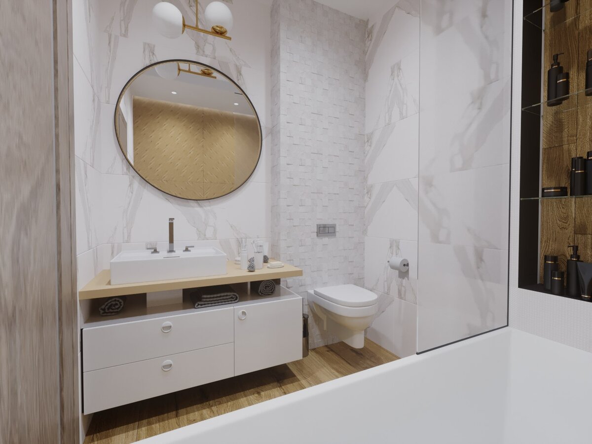 В современных домах, к сожалению, отводится очень мало места для ванной. В данном случае мы имеем комнату общей площадью -4,2м2, где необходимо разместить ванную, туалет и тумбу с раковиной. В такой стесненной площади решили использовать плитку спокойных светлых тонов, что хорошо вписалось в общую концепцию дизайна квартиры. Был выбран керамогранит под белый мрамор с теплыми бежевыми прожилками. Для контраста в зоне над ванной решили использовать керамогранит древесного цвета. Для поддержки этот решения на пол была выбрана плитка, размером 90*120 с очень красивым рисунком дерева. Так как размер по стене у нас был 1,9м, а до двери всего лишь 0,8м остановились на прямой, довольно бюджетной акриловой ванной 75*170, а оставшееся пространство обыграли коробом с нишей для ванных принадлежностей и косметики. Внутри нишу отделали такой же плиткой, что и на полу, а торцы покрасили в контрастный темно-серый цвет. Зону ванной отделяет стеклянная перегородка. Потолок в этой зоне немного занижен,