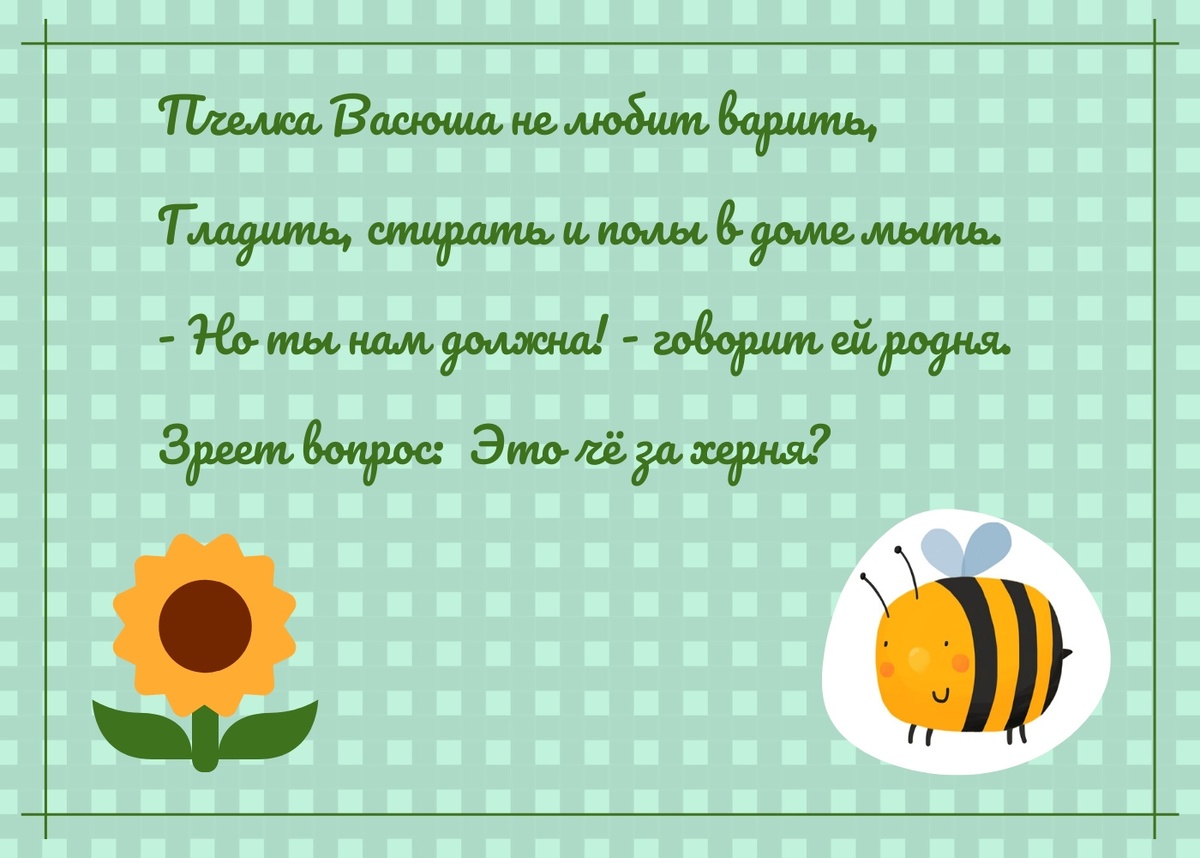 В каждой правильной девочке живёт #неправильнаяпчелкаВасюша Пчёлка Васюша не любит варить, Гладить, стирать и полы в доме мыть. - Но ты нам должна! - говорит ей родня. Зреет вопрос: Это чё за херня? 😁😁😁😁😁😁😁😁😁😁😁😁
