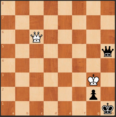 Предлагаю Вашему вниманию интересную позицию на шахматной доске. Черной пешке только ход до ферзя, но белые не дают это сделать. Однако ход черных, и они выигрывают. Смотрите так же Как красиво выиграл Свидлер чемпиона мира тут>>> Подписывайтесь на канал, интересные задачи ежедневно Решение идет далее 1. ...... Черные отдают ферзя на g6 2. Белые естественно бьют на g6 2. ..... черные ставят ферзя на g1, и далее теряется белый ферзь, после отхода белого короля от шаха. А выигрыш с ферзем прост.
