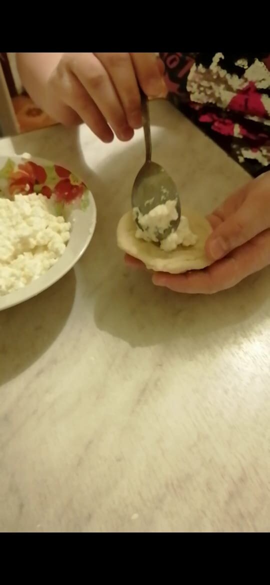 Сначала берём дрожжи, потом высыпаем её в ёмкость, потом тёплой водой покрываем дрожжи. Теперь перемешиваем вилкой, нужно убрать комочки, а теперь добавляем 5 столовых ложек сахара и половину столовой ложке соли. Перемешиваем опять вилкой. Перемешали добавляем 10 столовых ложек муки и опять перемешиваем. Высыпаем немного муки на стол. И теперь вымешиваем. Делаем кружок из теста ложим в ёмкость, накрываем пакетом. Ставим в тёплое место что б тесто поднялось. Прошло несколько минут, достаём тесто из ёмкости и опять вымешиваем. Теперь заворачиваем. Мы уже сделали из всего теста так. Теперь ложем на сковородку, и включаем газ, когда уже с одной стороны пожарились, то мы переворачиваем на другую сторону. Положили все, всё готово.