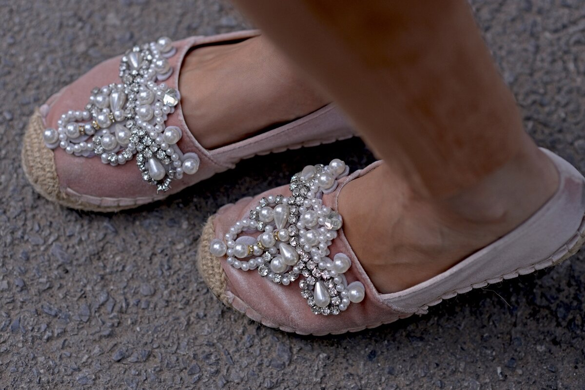 Не знаю, как у вас, у меня возникает именно такая ассоциация, когда смотрю на эти эспадрильи😆 наверное, кто-то в детстве много смотрел диснеевских мультфильмов🙈 Мама говорит, что я сорока😆 кидаюсь покупать все блестящее))) на самом деле, это неправда, но мимо этой пары пройти я просто не смогла! Ну посмотрите сами, какие же они красивые и мягкие! Это видно невооруженным глазом 😉 Покупала по этой ссылке Материал верха - мягкая бархатная ткань. Она теплая, так что в 30-градусную жару такую обувь не оденешь, а вот весной в сухую погоду - самое оно. Носок дополнительно укреплен и одновременно декорирован чем-то вроде плетеной бечевки светлого соломенного цвета, так сделано на многих мягких эспадрильях. Ну и, конечно, изюминка этой пары обуви - россыпь бусин и страз 💎 необыкновенно красиво и нежно ❤ Бусины пришиты надёжно и аккуратно. Я уже проносила эти лоферы целый сезон, ничегошеньки не отлетело! Единственное, чего посоветую не делать - не садиться в такой обуви за руль😩 не по