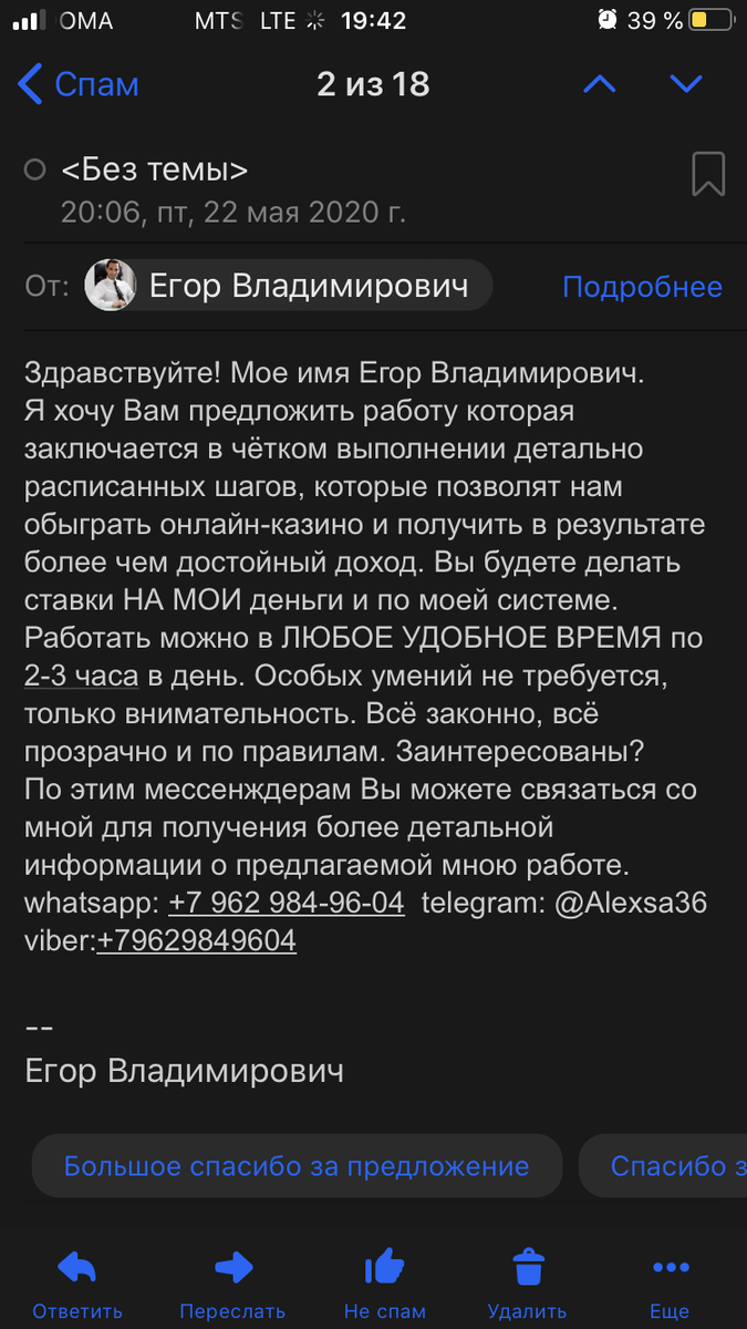 И так, расскажу о том как меня чуть ли не развели на деньги Все началось с того, что мне понадобилась работа в интернете, и я решила поискать все возможные способы. Начала оставлять анкеты и заявки на работу. Через какое-то время мне на почту пришло вот такое сообщение... Решила написать ему в телеграмм. Начали переписываться, он создал мне аккаунт, вот как это происходило.. Ну я и начала выполнять так сказать работу. Когда закончила отписалась ему, он ответил, тип можно выводить «заработанное» Решила попробовать вывести мои «миллионы», но не все так просто. Сайт уверяет нас перевести налог, который как они утверждают потом вернётся обратно на счёт Есть два варианта Понятное дело что таких денег у меня не было, да я и не рассчитывала вестись на это Решила связаться с ним Все это закончилось тем, что.. Его номер +7 962 984-96-04 Почта belovvalera1984@mail.ru