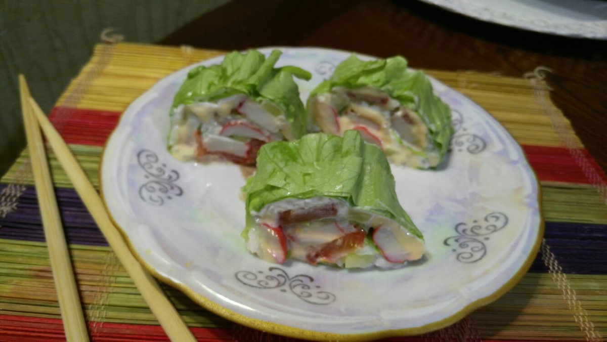 На столе необходимо расстелить пищевую пленку и выложить на нее чистые и просушенные листья салата. Выкладывать их нужно немного внахлест друг на дружку, чтоб не было "пробелов".