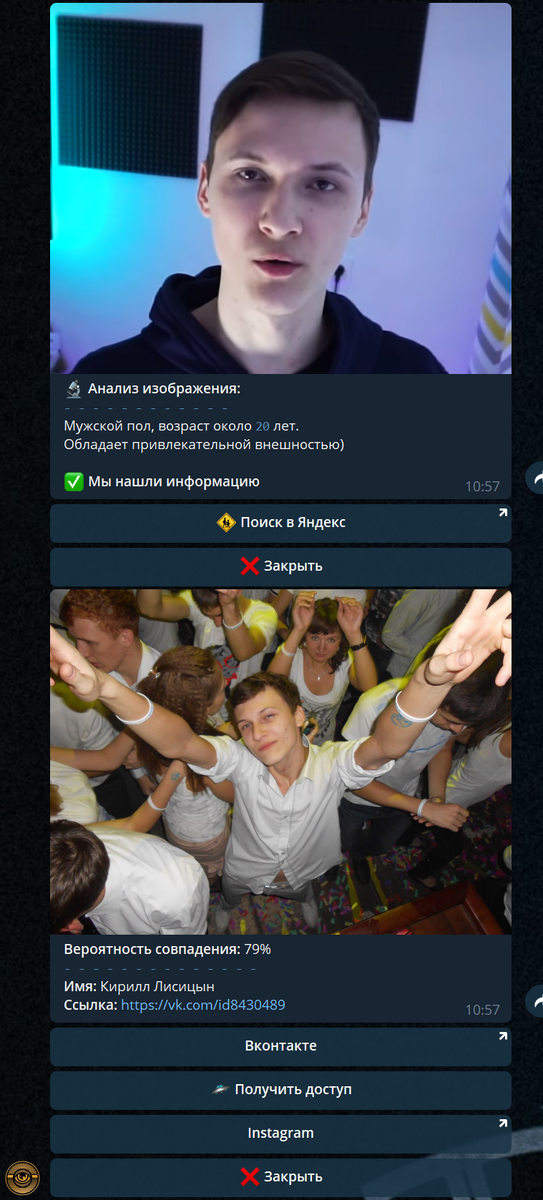 Итак, для начала в Telegram добавьте бота @EyeGodBot. Теперь надо только кинуть фотку боту и ждать поиска.