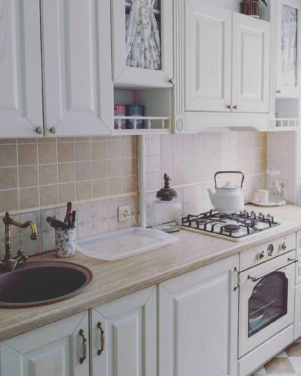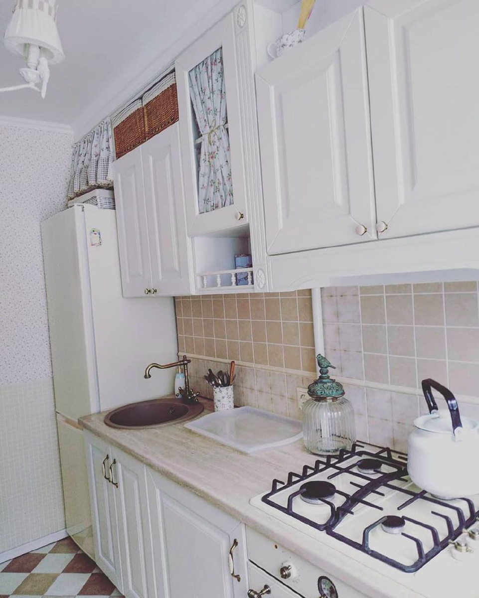 Появилась она благодаря желанию хозяев создать красивый и комфортный уголок в стиле «Прованс», «Кантри» или «Скандинавский». Определённой идеи в начале обустройства кухни не было, материалы подбирались по вкусу и без привязки к определенному направлению; разве что с определённого момента ключевой деталью стали маленькие птички, украшающие интерьер тут и там. В итоге получилось чудесное сочетание любовно подобранных предметов и декоративных вещиц, создавшее это «Французское кафе» — и, что поражает, разместилось оно на семи квадратных метрах!