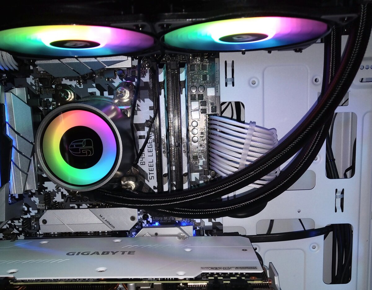 Так как нам важна не только качественная составляющая с эффективной производительностью, но и внешний вид с преимущественно белым цветом. Можно было бы не парясь выбрать какой нибудь башенный кулер, но в нем из белого цвета максимум был бы кулер, а его эффективность и качество стояли бы под сомнением. Поэтому выберем проверенную временем и с очень красивым белым исполнением жидкостную систему DeepCool GamerStorm CASTLE 360 EX WH.