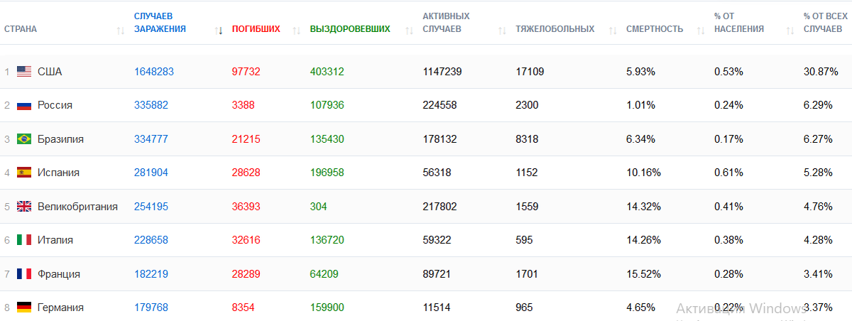 Я слишком давно живу в этой стране, чтобы доверять официальной статистике. Для примера возьмём среднюю зарплату в России. Согласно данным Росстата в 2019 году она составила 44 тыс. руб. Мягко говоря, вызывает сомнения. Вот так и во всём остальном. Конкретно с короной меня смущает запредельно высокое количество якобы сделанных тестов и при этом процент смертности ниже, чем где бы то ни было в мире. Вот скриншот на момент публикации (23.05.2010): А также тот факт, что первый случай у нас официально зарегистрирован 1 марта, когда в Китае и Италии была уже настоящая жара. Но да ладно, о честности статистики особо не будем - в данном случае она совершенно неважна. Нет никаких сомнений, что болезнь существует а смертность от неё в той или иной степени имеет место. Важно, что меры по сдерживанию короны, похоже, что оказались губительнее самой короны. Экономику угробили на ровном месте и не понятно, как теперь её восстанавливать будем. Но к счастью, всё говорит о том, что наши правители это