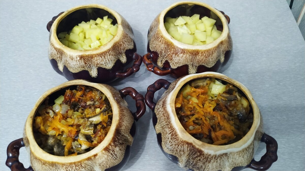Сверху мяса укладываю картошку и последним слоем заранее обжаренные на сковороде лук, морковку и грибы.