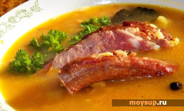 Эх какой супец мы седня забабаним! Для приготовления 5 литров горохового супа со свиными копчеными ребрышками понадобятся : Гороховый суп с ребрышками с древних времен являлся главным блюдом бедняков практически всей Европы. Это произошло потому, что горох является неприхотливым и очень урожайным растением. Высушенный горох очень долго хранится, сохраняя все свои полезные свойства. Горох содержит очень много белка, который по составу очень близок к белку мяса, поэтому он очень питателен. Вкусными гороховыми супами с ребрами славятся Великобритания, Нидерланды, Финляндия, Германия и Швеция. В каждой из этих стран есть свой рецепт густого супа с ребрышками. Не менее любим гороховый суп и в странах Восточной Европы. В России, Польше, Украине его подают с гренками. Этапы приготовления супа Вот пошаговый рецепт с фото густого горохового супа с копчеными свиными ребрышками по-старинке. Так готовят суп в России с давних времен. Горох замачивают, как правило, на ночь, а утром начинают готовить
