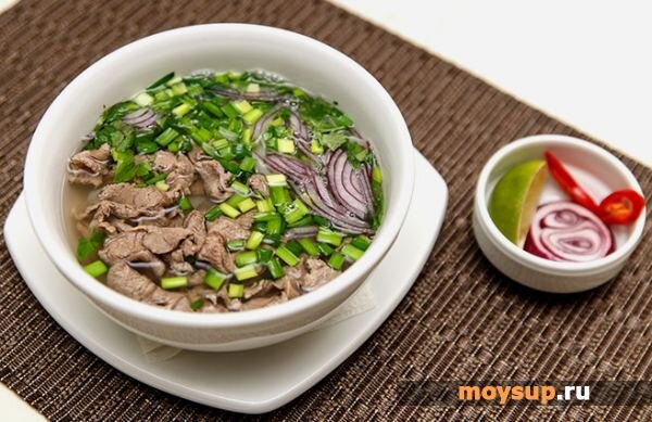 - с рыбой - фо ка. В классическом рецепте вьетнамского супа фо, лапша готовится из рисовой муки. Но, при отсутствии рисовой лапши, вполне подойдёт и обычная лапша из супермаркета. Когда во Вьетнаме шла война, вьетнамские жители вынуждены были стать беженцами. Так, с 60х годов 20го века, рецепт супа фо начал распространяться по миру. В самом Вьетнаме есть два варианта подачи: северный, с широкой лапшой и большим количеством зелёного лука и южный – сладкий суп со всевозможными травами и лаймом. Предлагаем более подробно рассмотреть, как приготовить классический вьетнамский суп фо. Ингредиенты (на 4 порции): Для подачи: Готовим традиционное блюдо вьетнамской кухни Варим бульон для супа фо бо. Как написано выше, фо бо – это вьетнамское блюдо с говядиной.