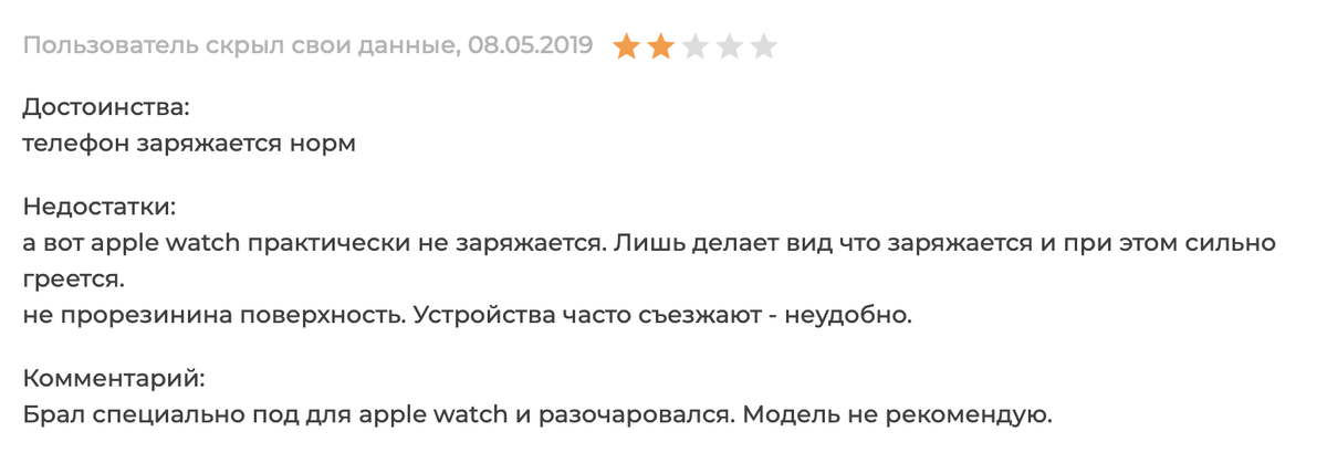 Это комментарии к разным зарядкам за 2-4 тысяч рублей. К сожалению, это не бракованные устройства - это компания Apple, которая с прошивками меняет совместимость зарядок. Зарядка для часов - не открытый стандарт QI. В часах стоит другая технология с дополнительными магнитами. Поэтому Apple просто не дает заряжаться часам на таких зарядках, которые пытаются подделать. А все модели стоимостью меньше 8 тысяч рублей - просто копии для зарядки часов Apple Watch. Поэтому если не хотите покупать зарядку за 10 000 рублей, но хотите удобный девайс, то читайте дальше.
