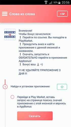 Как зарабатывать в AppBonus? Промокод AppBonus NFFMUK В AppBonus вам предлагают зарабатывать на загрузках приложений из официальных магазинов Play Маркет или App Store. Работа в сервисе осуществляется через мобильное приложение AppBonus. Сделано оно качественно и легко в освоении. Из функциональности вам доступно следующее: отображение списка доступных для скачивания приложений, просмотр баланса и вывод денег В разделе меню «Задания» находится список доступных для скачивания приложений. В одном задании помимо скачивания могут содержаться дополнительные условия. Оплата заданий происходит только в том случае, если выполняете вы их правильно, то есть не нарушаете порядок установки и соблюдаете условия. Чтобы не возникало недоразумений, следуйте простой инструкции: Дополнительными условиями для выполнения задания могут быть: 1) написать отзыв в Play Маркет или App Store; 2) сохранить приложение на телефоне на несколько дней; 3) запустить приложение на определенное время. Обязательно с