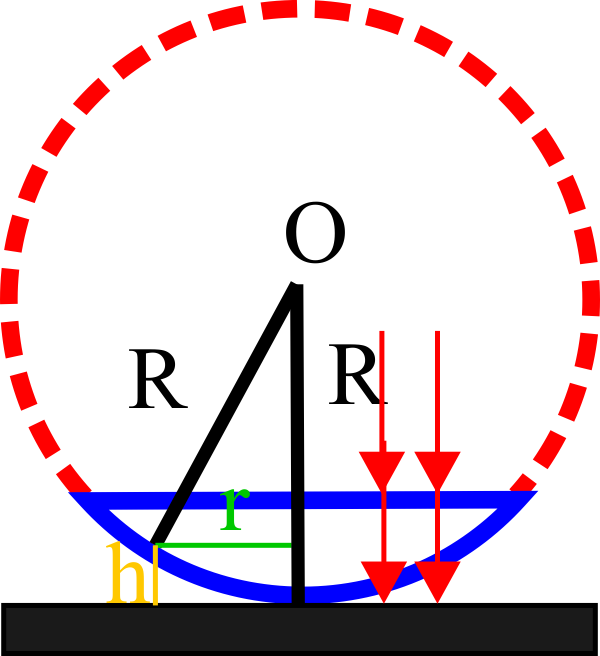 Плосковыпуклая линза касается плоской стеклянной пластинки(рис. 5.9). На линзу падает параллельный пучок света. Между лучами, отражёнными от сферической поверхности линзы (а) и от поверхности пластинки (б), имеется разность хода, которая зависит от расстояния между линзой и пластинкой. В результате интерференции этих лучей образуются линии равной толщины – тёмные и светлые кольца (кольца Ньютона), которые можно наблюдать как в отражённом, так и в проходящем свете. Получите выражения для радиусов rk тёмных и светлых колец Ньютона в отражённом свете. Известен радиус кривизны линзы. Между линзой и пластинкой находится воздух. // Ремизов А.Н., Максина А.Г. "Сборник задач...", 2001 г. https://bookmix.ru/bookprice.phtml?id=84492 Рисунок 1. Лучи света падают на верхнюю грань плоско-выпуклой линзы. На некотором расстоянии r от вертикали они частично отражаются и частично проходят. Отражённые лучи интерферируют с лучами, которые дважды проходят воздушный промежуток с длиной h между линзой и п