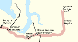 На правом берегу реки Пур расположен старый Уренгой, с которым железнодорожного сообщения нет. Между реками Пур и Турухан дорога не была достроена. Так, по некоторым данным, отделение в Долгом сумело построить порядка 15 километров трассы в сторону Ермаково, и ветку в Седельниково. Два других строительных отделения 503 стройки, располагавшиеся в Яновом Стане и Ермаково, к 1953 году соорудили участок протяжённостью 140 километров и открыли рабочее движение на нём, продвигаясь дальше на запад. К 1953-му году уложено около 65 км полотна от Игарки на юг по направлению к станции Енисейская (напротив Ермаково). В действительности на данный момент точная длина построенного участка от Игарки на юг по направлению к станции Енисейская (напротив Ермаково) неизвестна. Есть три цифры — 50.2 км, 65 км и 43.2 км (10 км на юг от реки Сухариха).