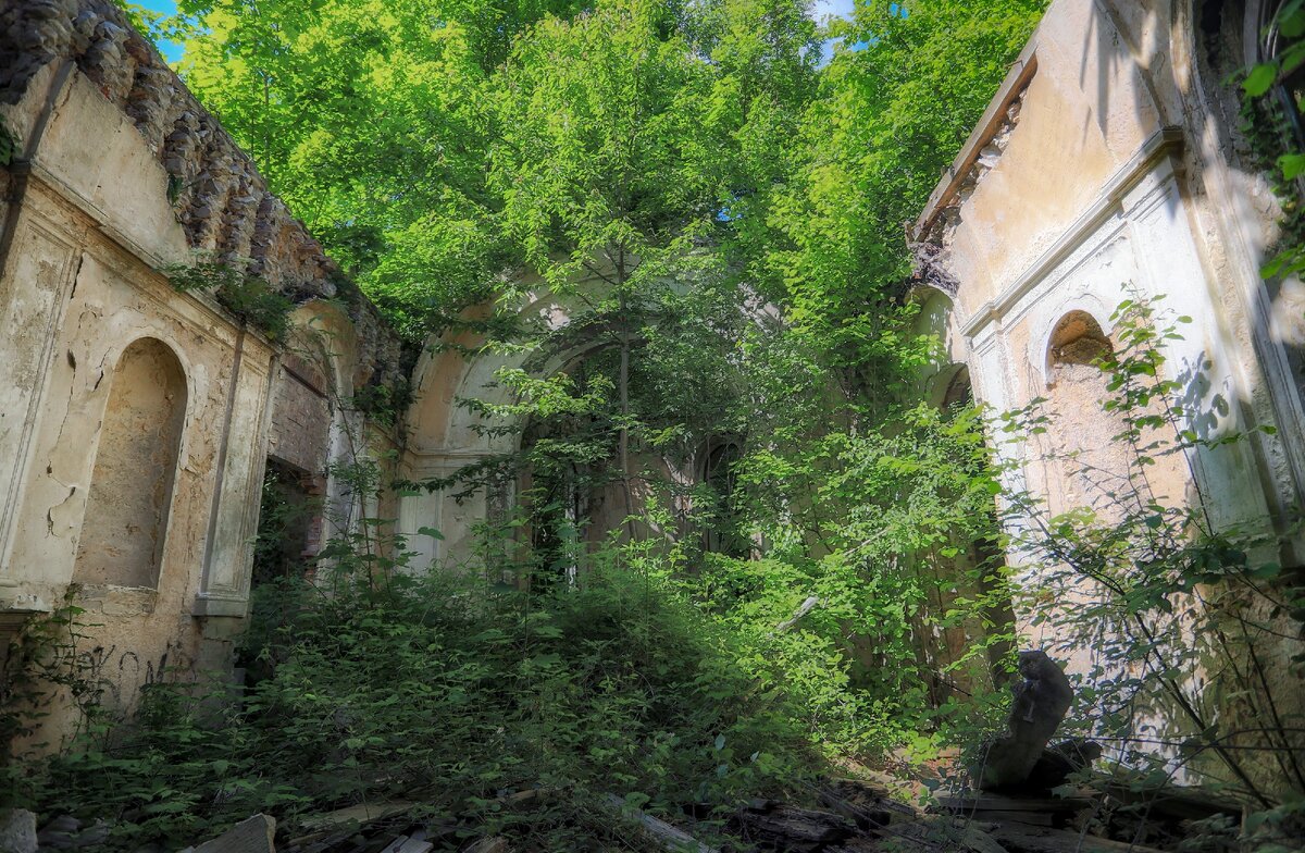 И только передняя стена, что возвышается над крыльцом, напоминает о старом великолепии. Крыша давно упала, и внутреннее убранство уже давно кануло в Лету под кронами беспорядочных деревьев.