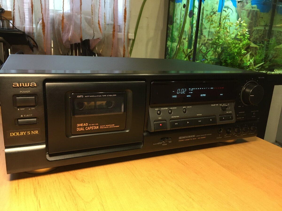 Aiwa AD-S950 - топовая модель с двухмоторным ЛПМ, сквозным каналом и закрытым трактом. Отличительной особенностью является наличие эффективной системы шумопонижения Dolby S (Dolby B и C тоже в наличии). Дека автоматически определяет тип ленты, имеет ручную калибровку и прописать может, практически, что угодно. Дизайн довольно специфический. С точки зрения эргономических удобств все в порядке, но внешний вид на любителя - по мне, так не очень, мягко говоря.