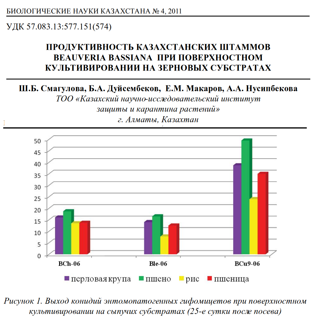 В статье рассмотрены и изучены различные зерновые субстраты для выращивания боверии. Установлено, что для наработки конидий наиболее предпочтительны пшено и перловая крупа. Авторы отмечают, что их данные во многом совпадают с результатами зарубежных исследователей: для массовой наработки препаратов #GreenMuscle #GreenGuard #MycocideGH и #Mycotrol используются просо и рис. В статье отмечается, что необходимым элементом экологизации земледелия являются биопрепараты на основе естественных агентов биоконтроля, которые обладают выраженной избирательностью действия, признаны безвредными для человека, теплокровных животных, пчел, птиц, рыб. Они быстро разлагаются в почве, воде, под воздействием солнечных лучей, не вызывают в сравнении с химическими препаратами привыкания к ним насекомых. Поэтому биологическую защиту растений следует считать приоритетным направлением при разработке интегрированных систем борьбы с вредителями и болезнями. Перспективной группой являются энтомопатогенные грибы, о