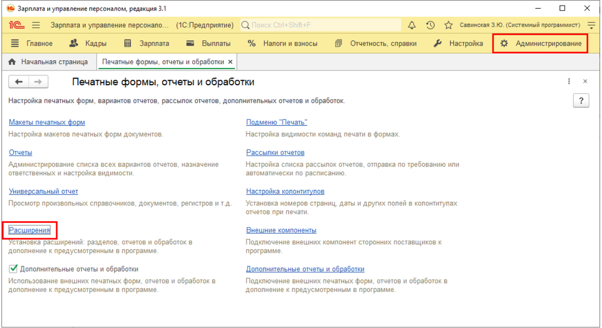 Возможность поставляется в виде так называемого расширения и не требует обновления конфигурации. Установка производится администратором или другим пользователем с полными правами в разделе Администрирование – Печатные формы, отчеты и обработки – Расширения.