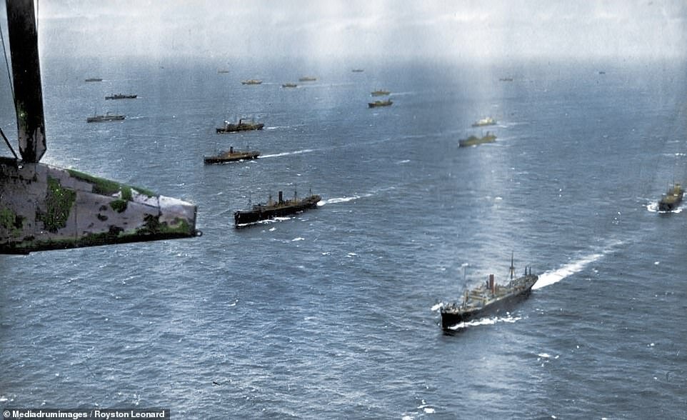 Цветные изображения показывают, как командам приходилось сражаться со стихией во время зимних штормов, когда они защищали суда снабжения, доставляющие предметы первой необходимости в Советский Союз. На этом фото торговый корабль плывет через огромные волны во время конвоя RA-64 в 1945 году. Конвой покинул Шотландию 3 февраля, доставил грузы в Мурманск через 12 дней, а уже 28 февраля вернулся в Лох Ю.