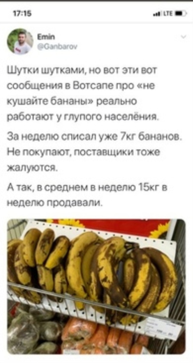 Первой «жертвой» коронавируса во Владивостоке стали бананы. Торговцы фруктами жалуются на резкое падение спроса на бананы, сообщает «Восток-Медиа» со ссылкой на «Новые известия». Неизвестные распространили информацию о том, что бананы сейчас опасно употреблять, так как эти фрукты заражены китайским коронавирусом. Слухи об этом стали рассылать местные жители в мессенджерах. Как итог — фрукты из-за отсутствия спроса стали чернеть и портиться.Некоторые торговцы даже существенно скидывают цену на фрукты, однако на интерес покупателей, уверяют продавцы, это не влияет. Информация об этом вызвала смех пользователей социальных сетей: «Мне вот было интересно, как связан коронавирус в Китае с бананами из Эквадора?», «В Экономыче на ящиках с бананами написали большими буквами «Эти бананы из Эквадора!!!». Слухи о "банановой угрозе" дошли даже до известного врача-инфекциониста, педиатра Евгения Комаровского. На своей официальной странице в социальной сети Instagram Евгений Олегович поспешил успок