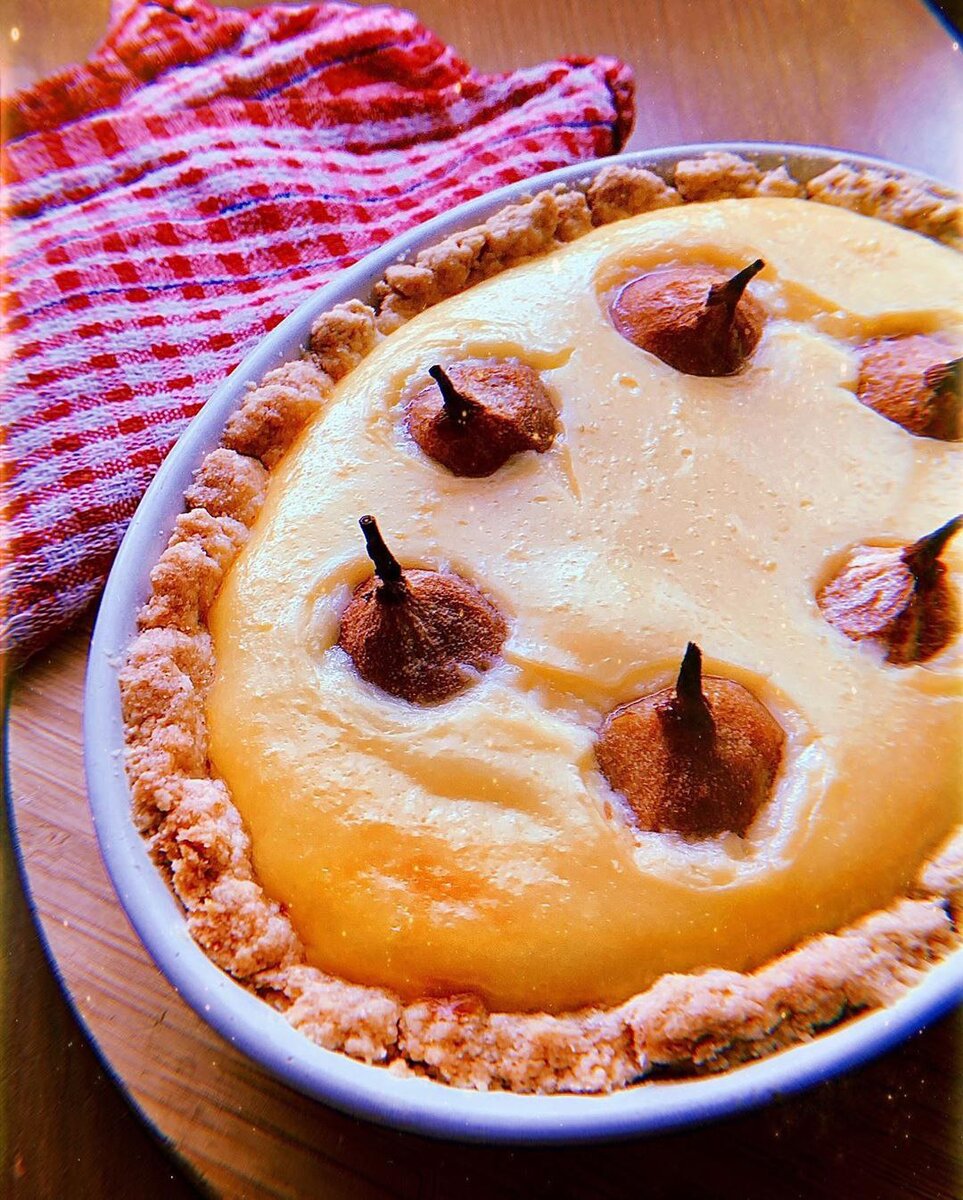 Тарт(пирог) с заварным кремом и томлеными грушами: Берем 1) Рассыпчатая и хрустящая песочная основа: •сливочное масло 100-125гр(маленький брикет), •мука пшеничная 1 стакан •желток •крупа манная 1/2 стакана •сахар ст. ложки, •соль щепотка Делаем: •Растереть в мягкую маслянистую крошку. •Сформировать шар •Если тесто рассыпается - добавить ложку воды/молока. •На полчаса в холодильник. 2) Завариваем ароматный крем: •молоко 0,5л. •2 желтка •2 столовые ложки муки •лиманная цедра по вкусу и аромату, •ванилин щепотка •сахар 4-5 ст. ложек(по вкусу) •соль щепотка. Делаем: •Ставим молоко на маленький огонь, греем, но не кипятим. •добавляем ингредиенты, постоянно помешиваем и следим! Чтоб не пригорело и не было комочков. До густоты. •Груши чистим, в кастрюле греем воду с сахаром, цедрой лимона. Кладём груши, припускаем минут 5. Можно добавить коньячку 😉 тогда уже груши будут пьяные) •Собираем тарт: смазываем маслом форму, посыпаемся манкой распределяем тесто •у груш отрезаем попочки, ставим их