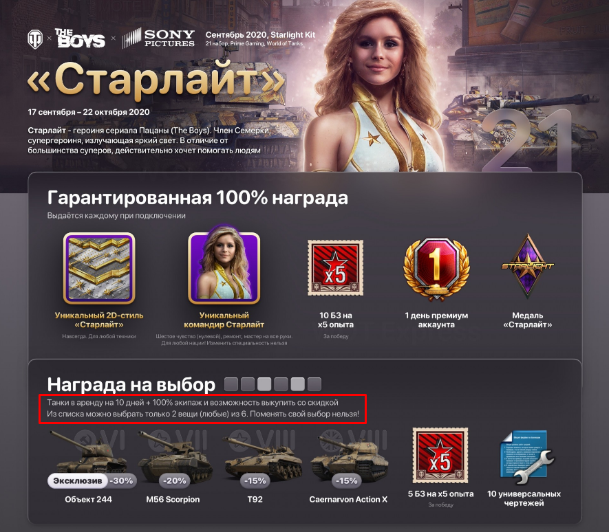 21 набор Twitch Prime пакета «Старлайт», действует с 17 сентября 23:01 по 22 октября 19:59 (МСК) 2020 года. Премиальный контент для World of Tanks, предоставленный платформой Twitch, Amazon Prime и компании Wargaming. Получите бонусный контент, скидки и другие плюшки. Что входит в пакет «Старлайт»: