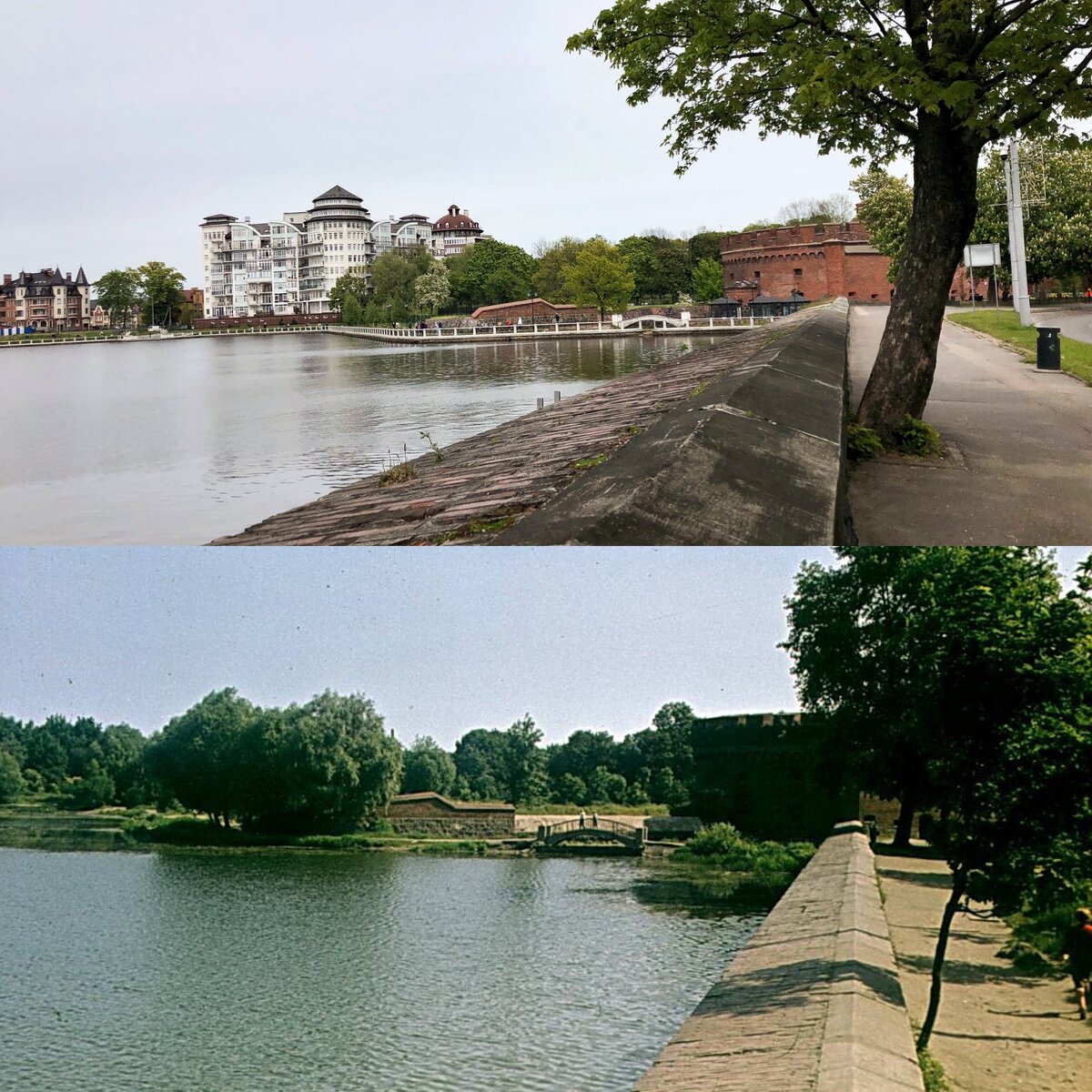 Начнем мы с улицы Черняховского и видом на Башню Дона, сравним с тем что было в 1969 году. Как раз именно в этом году было принято решение о создании музея янтаря в Башне Дона. Рядом пешеходный мост, соединяющий территорию музея с набережной пруда, который с недавнего времени приобрёл имя: "Мост Ремесленный". Левее появилась застройка, красота архитектуры высотки конечно же вызывает сомнения.