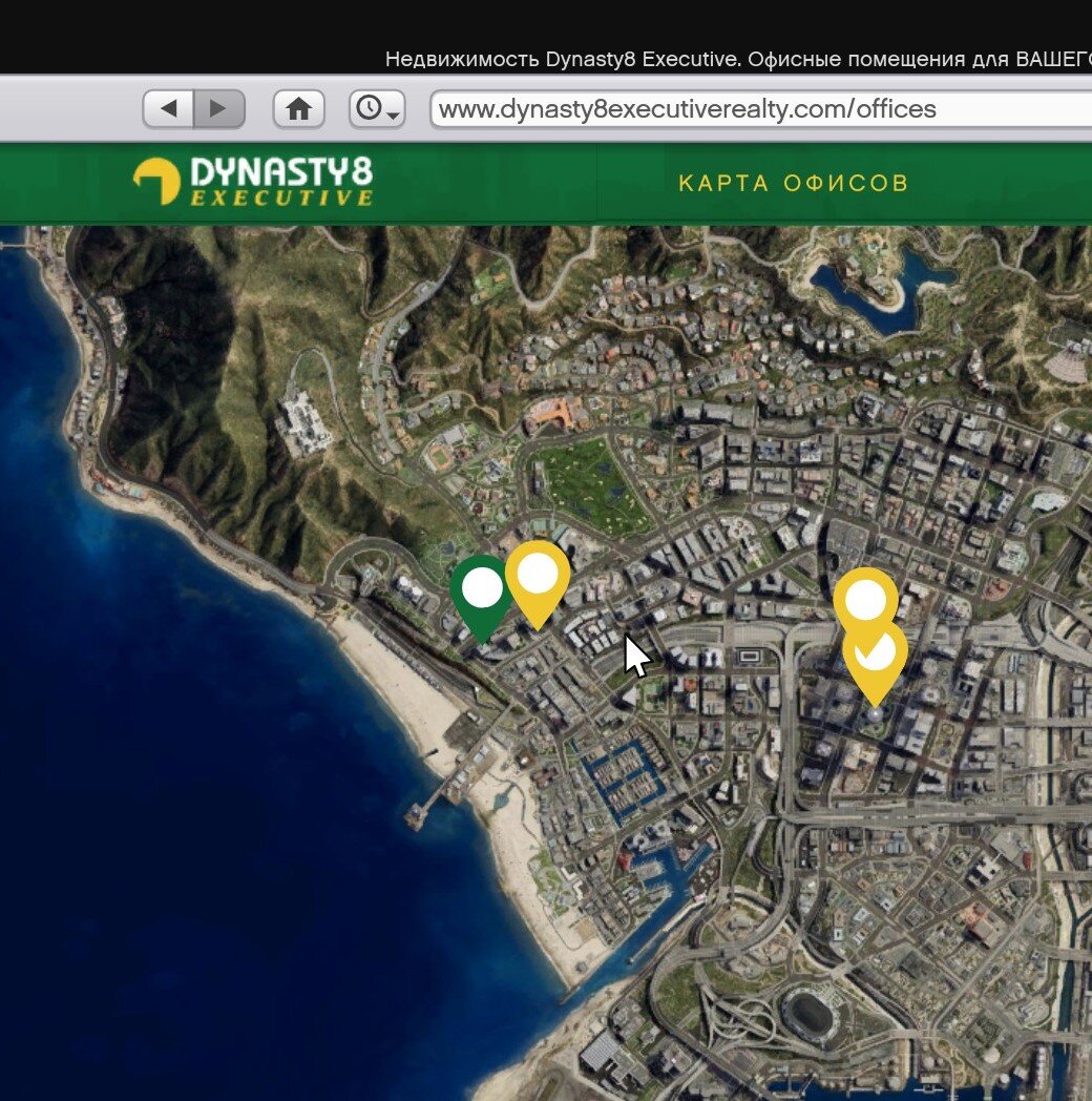 В игре нужно зайти в телефон, там раздел интернет, там Деньги и ууслуги и затем перейти на один из сайтов с недвижимостью. Maze bank forclosure торгует клабхаусами, бункерами. Dynasty 8 executive торгует офисами. Dynasty 8 real estate торгует квартирами и гаражами. Далее вы просто находите то, что указано ниже и можете получить его за 0 долларов.