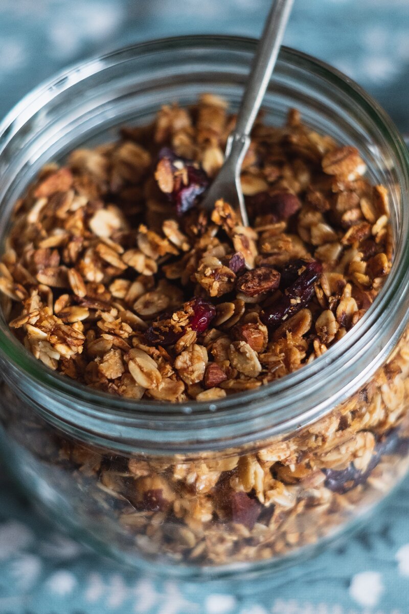 Ингредиенты: Овсяные хлопья 250 г. Сироп топинамбура 70 мл. Миндаль 15 г. Кешью 12 г. Грецкий орех 12 г. Фундук 15 г. Сушёная клюква или вишня 35 г. Подсолнечное масло 40 мл. Кокосовая стружка 35 г. Орешки слегка измельчить. В большой миске смешать овсянку, орехи, сироп, масло и кокосовую стружку, всё хорошо перемешать. Разогреть духовку до 180°С. Противень застелить бумагой для выпечки или силиконовым ковриком. Выложить гранолу и отправить в духовку на 10-15 минут и выпекать до золотистого цвета и приятного аромата. Во время выпечки нужно периодически открывать духовку и помешивать гранолу лопаткой. Готовую остывшую гранолу перемешать с сушеными фруктами и уложить в баночку. Гранола отлично подойдет на завтрак в сочетании с греческим йогуртом, смузи или молоком. Приятного аппетита! Калорийность: 430 ккал/100 г.