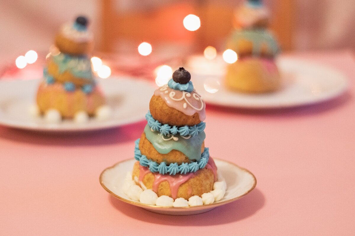Ингредиенты (3 пирожных): Заварное тесто: Мука 62 г Молоко 40 мл Вода 70 мл Сахар 5 г Соль 2 Масло сливочное 50 г 2 яйца ~ 80 г Наполнение: 2 яичных желтка Кукурузный крахмал 30 г Молоко 250 мл Сахар 50 г Какао-порошок 5 г Молочный шоколад 50 г Масло сливочное 20 г Глазурь: Сахарная пудра 100 г Молоко ~ 15 мл Розовый и зеленый пищевой краситель Крем: Сливочный сыр 100 г Жирные сливки 20 мл Синий пищевой краситель